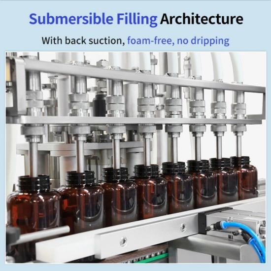 El llenado por inmersión de fondo es una de sus principales características. Durante el proceso de llenado, el cabezal de llenado se mantiene siempre por debajo del nivel del líquido. Este diseño soluciona inteligentemente el problema de la formación de espuma y salpicaduras. En el caso de líquidos que forman espuma fácilmente, como los que contienen surfactantes y ciertos líquidos orales, el método tradicional de llenado suele sobrepasar el nivel del líquido, lo que provoca un contacto violento entre el líquido y el aire, generando una gran cantidad de burbujas. Estas burbujas no solo ocupan el espacio del recipiente, afectando la precisión del volumen de llenado, sino que también pueden desbordar el recipiente, generando desperdicio de líquido y contaminación del equipo. Sin embargo, con el llenado por inmersión de fondo, dado que el cabezal de llenado se encuentra muy por debajo del nivel del líquido, este se inyecta suavemente en el recipiente, reduciendo considerablemente el contacto con el aire e inhibiendo fundamentalmente la formación de burbujas. Al mismo tiempo, evita que el líquido salpique fuera del recipiente por impacto, reduciendo aún más la pérdida de líquido.