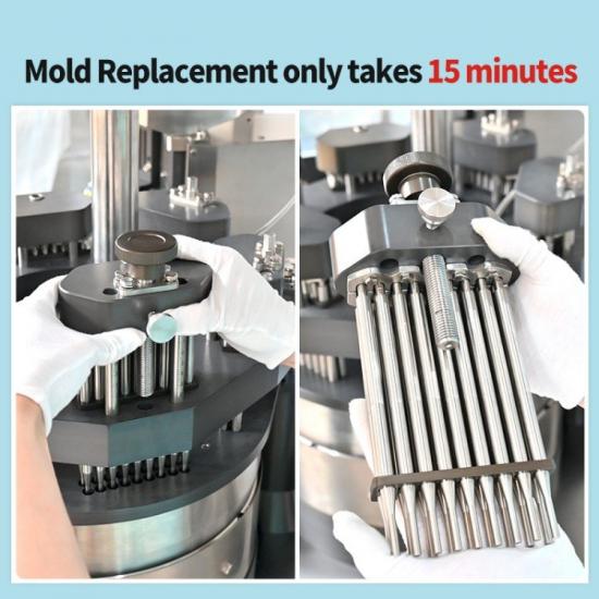 Además, los moldes modulares de la encapsuladora admiten tamaños de cápsula desde el n.° 000 hasta el n.° 5. El cambio de tamaño es rápido. Los operadores pueden seguir la guía estándar de operación y mantenimiento de la máquina proporcionada por Rich Packing. Normalmente, el cambio se realiza en 20 minutos. Esta flexibilidad permite a las empresas ajustar rápidamente sus planes de producción y satisfacer las necesidades de producción de diferentes tamaños de cápsula. Esto mejora aún más la eficiencia de la producción y el uso del equipo.